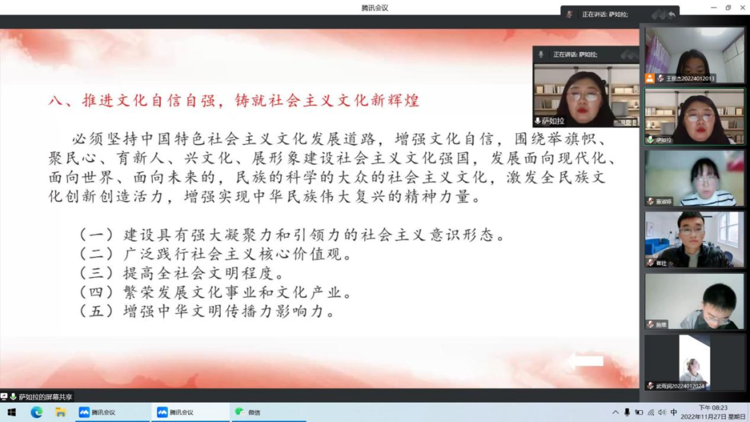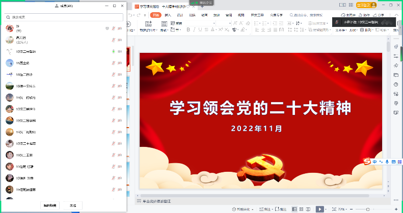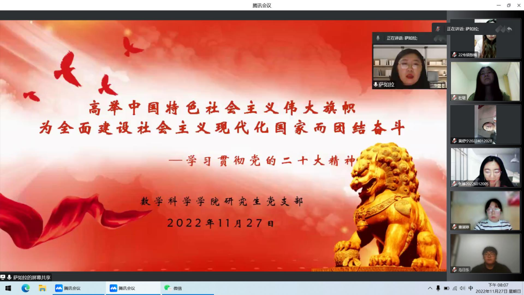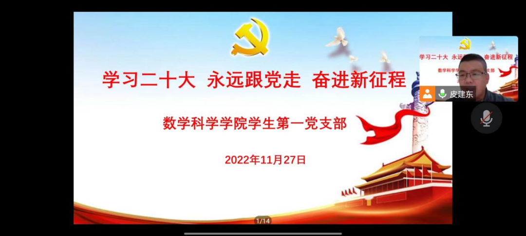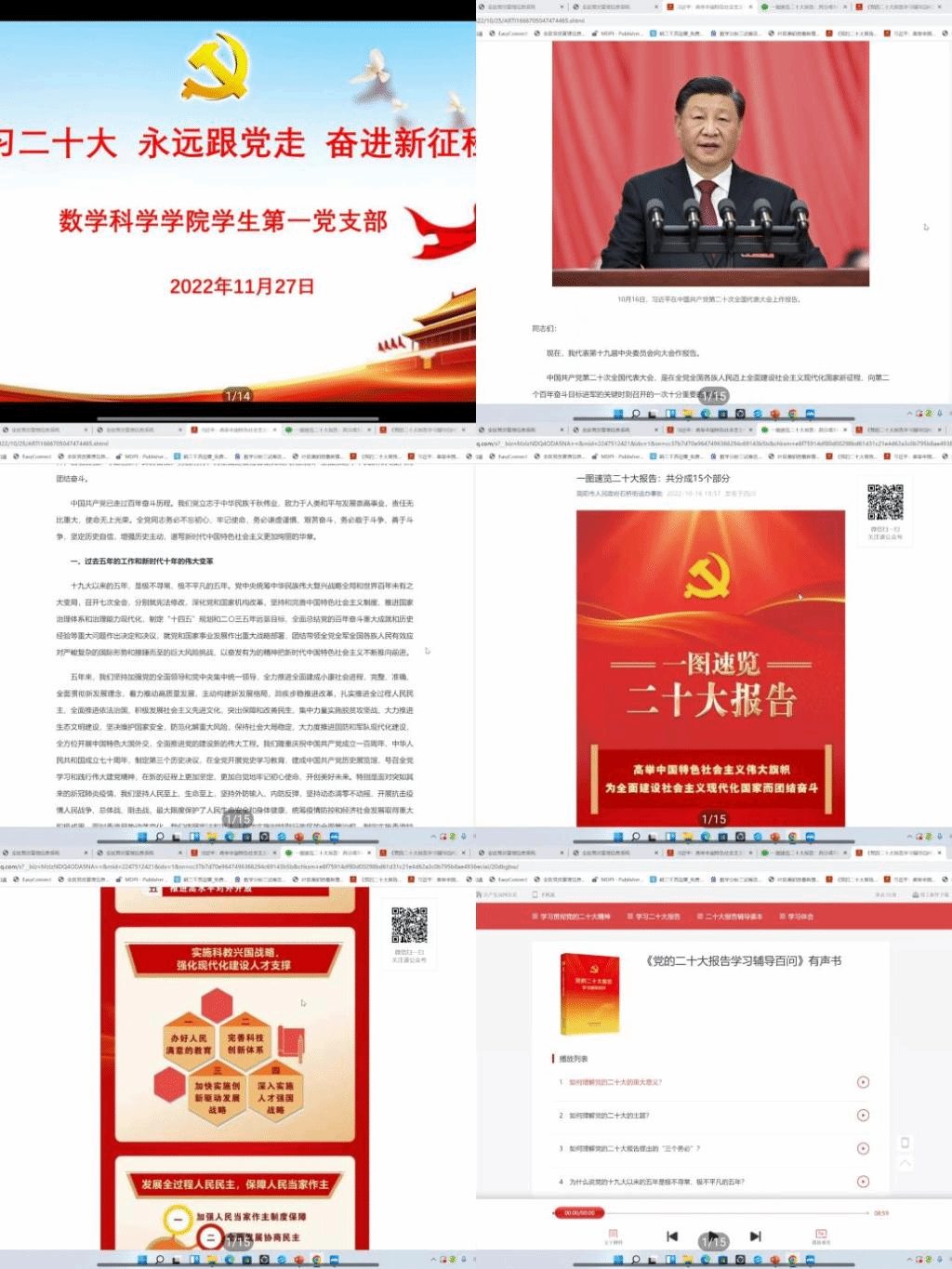 为深入学习宣传贯彻党的二十大精神,引导广大党员青年自觉把智慧和力量凝聚到党的二十大确定的各项目标任务上来,更好团结引领广大党员青年紧跟党奋进新征程、夺取新胜利,数学科学华体会(中国)学生第一党支部、学生第二党支部及研究生党支部于2022年11月27日晚开展“学习领会二十大精神”主题活动。