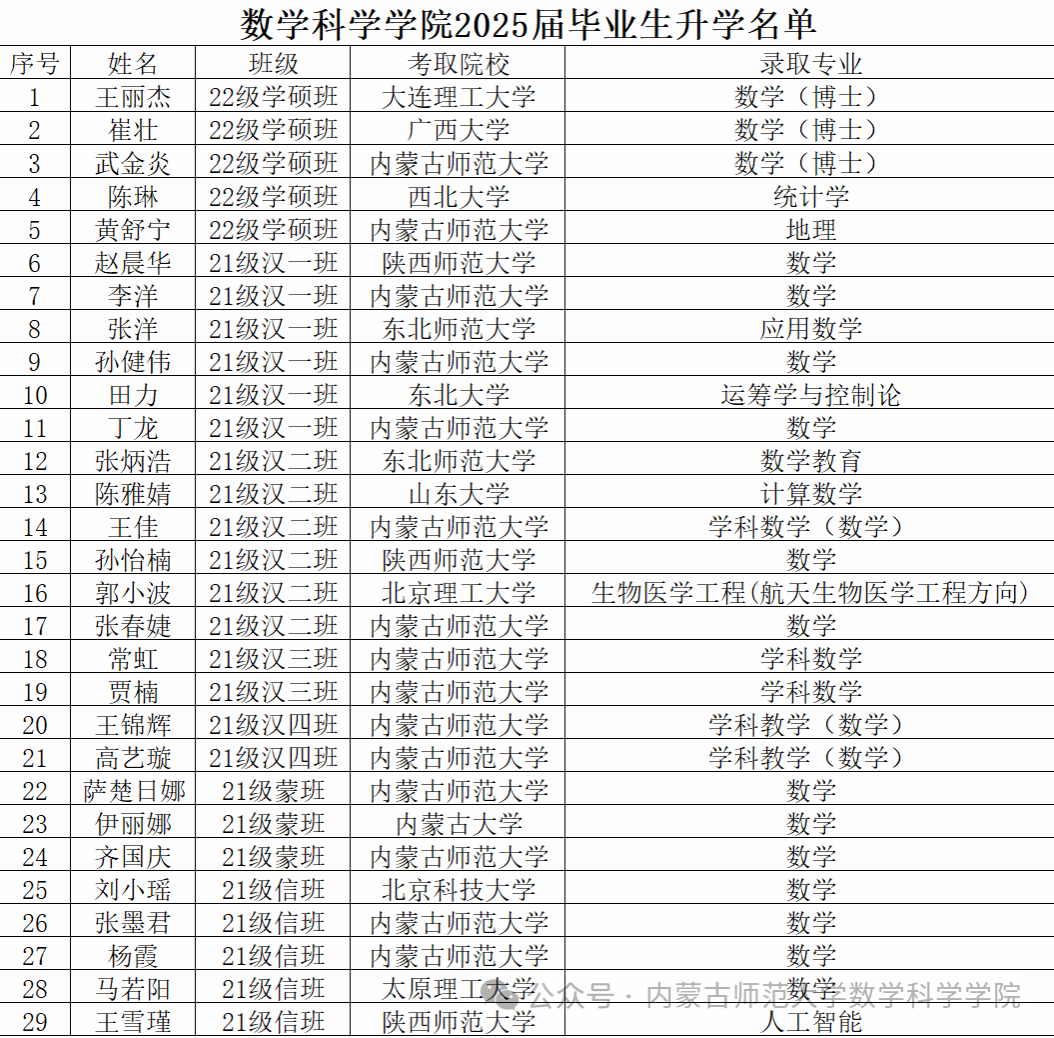 2025年数学科学华体会(中国)考取博士、硕士研究生名单如下(共29名,排名不分先后):