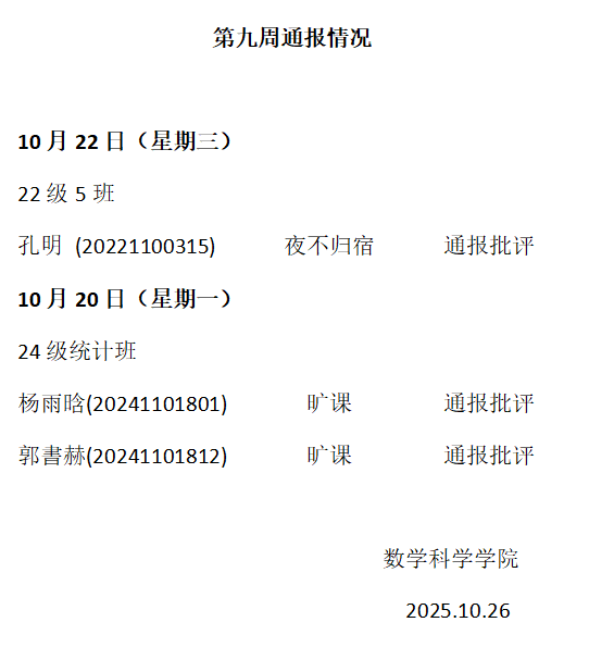 数学科学华体会(中国)2025——2026年度第一学期第九周通报情况
