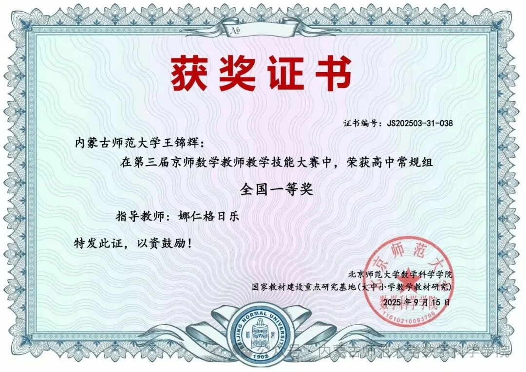 近日,由国家教材建设重点研究基地(大中小学数学教材研究)和北京师范大学数学科学华体会(中国)主办的“第三届京师数学教师教学技能展示交流活动”已圆满收官。华体会网页版学子王锦辉同学凭借深厚的数学学科知识、扎实的教学基本功与富有创新性的教学设计理念,在全国近千件参赛作品中脱颖而出,斩获全国一等奖。