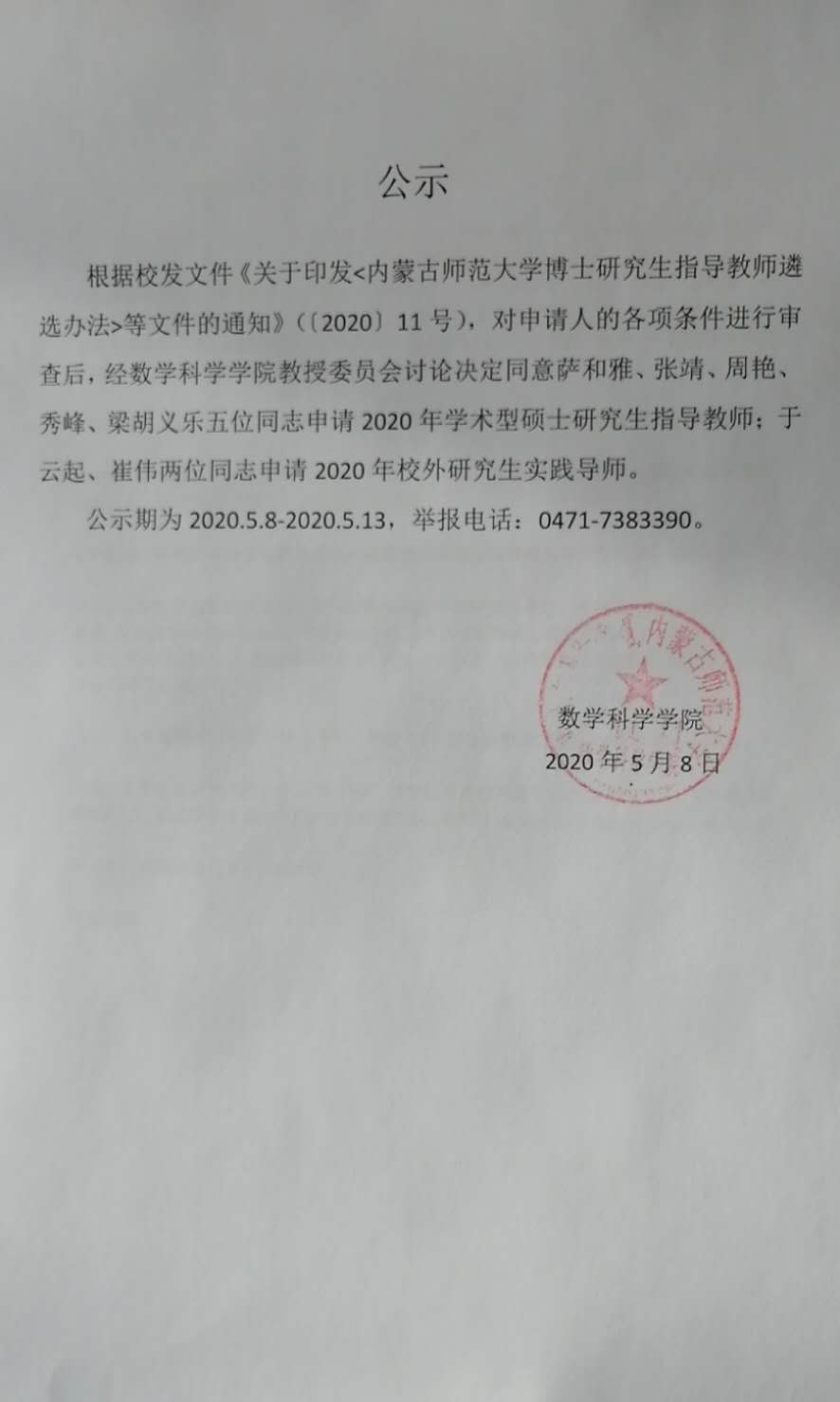 关于2020年度数学科学华体会(中国)申请研究生指导教师的评审公示