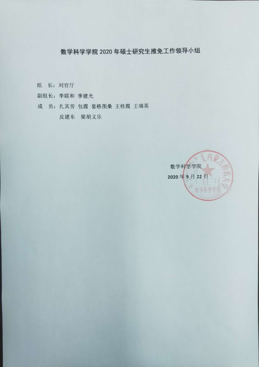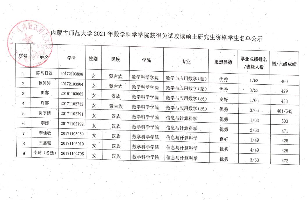 为保障推荐优秀应届本科毕业生免试攻读硕士学位研究生(以下简称推免生)工作的顺利发展,促进本科教学质量的提高,根据《内蒙古师范大学推荐优秀应届本科毕业生免试攻读硕士学位研究生工作实施办法》文件精神,结合华体会(中国)实际,通过数学科学华体会(中国)2021年优秀应届本科毕业生推荐免试攻读硕士学位领导小组工作(以下简称推免工作)会议,评选出了获得2021年数学科学华体会(中国)推荐免试攻读硕士研究生资格的学生及预备推荐免试攻读硕士研究生资格学生名单。现对推免工作领导小组成员、获得2021年数学科学华体会(中国)获得推荐免试攻读硕士研究生资格学生(预备推荐学生)名单进行公示,具体内容请见附件!