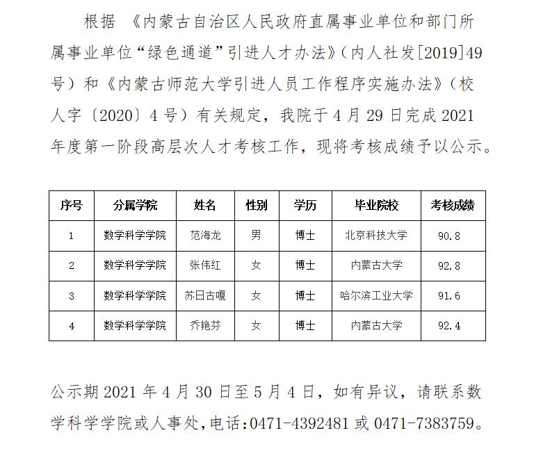 数学科学华体会(中国)2021年高层次人才考核成绩公示