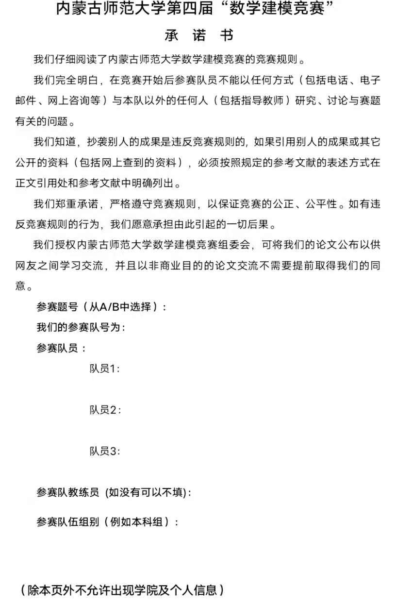 内蒙古师范大学第四届“数学建模竞赛”承诺书