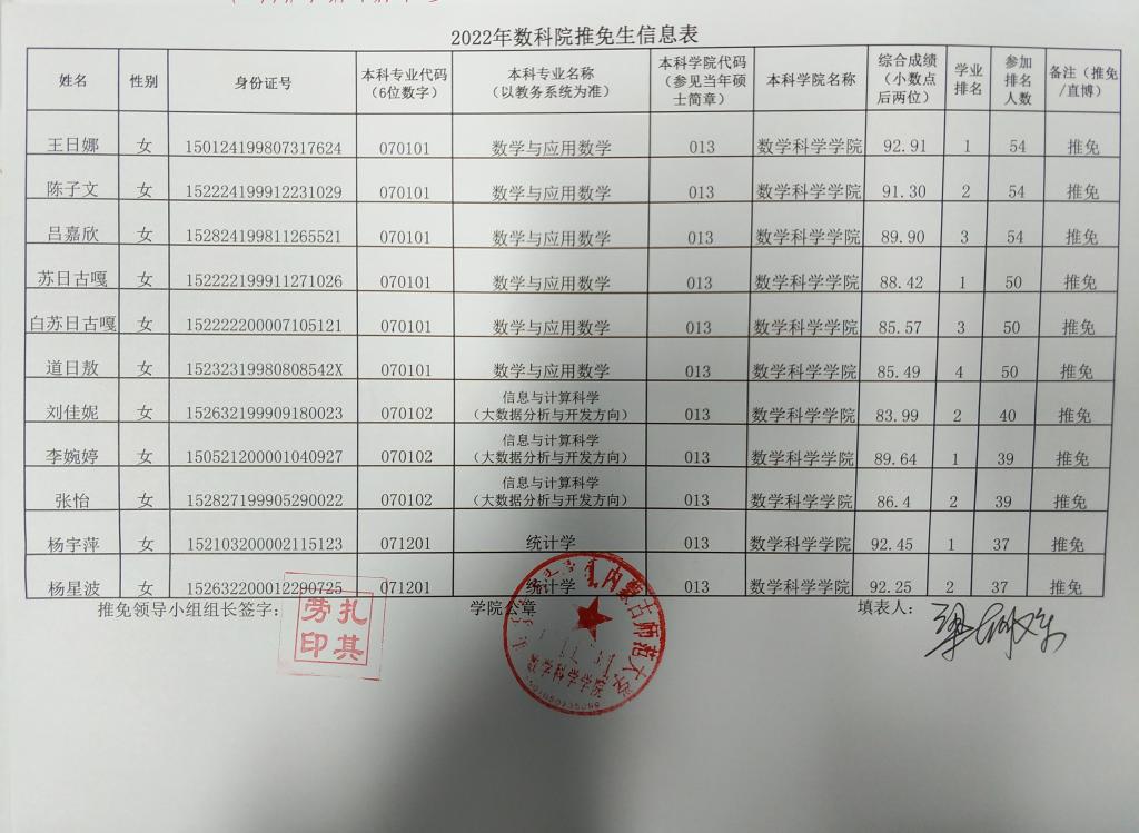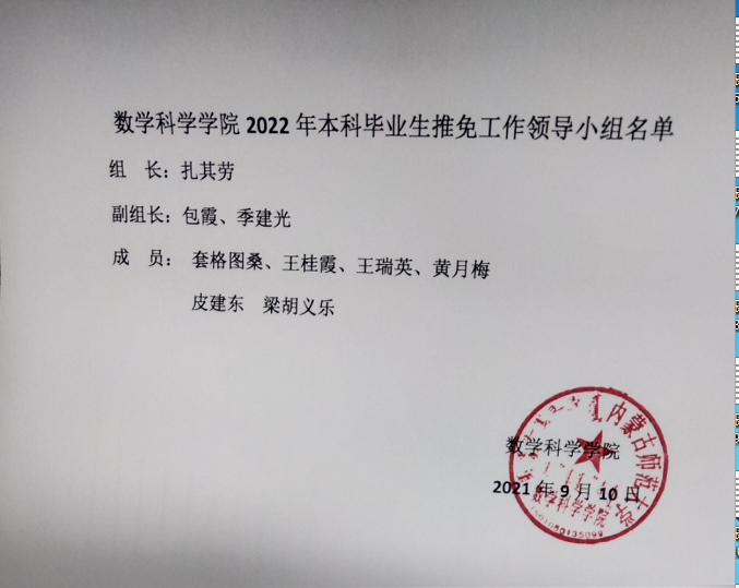 为保障推荐优秀应届本科毕业生免试攻读硕士学位研究生(以下简称推免生)工作的顺利发展,促进本科教学质量的提高,根据《内蒙古师范大学推荐优秀应届本科毕业生免试攻读硕士学位研究生工作实施办法》文件精神,结合华体会(中国)实际,通过数学科学华体会(中国)2022年优秀应届本科毕业生推荐免试攻读硕士学位领导小组工作(以下简称推免工作)会议,评选出了获得2022年数学科学华体会(中国)推荐免试攻读硕士研究生资格的学生及预备推荐免试攻读硕士研究生资格学生名单。现对推免工作领导小组成员、获得2022年数学科学华体会(中国)获得推荐免试攻读硕士研究生资格学生(预备推荐学生)名单进行公示,具体内容请见附件!